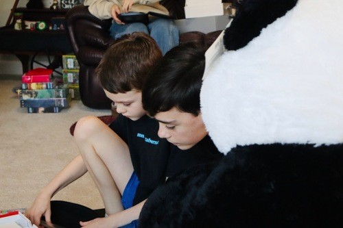 Behold, the giant panda stalking its prey. Two unsuspecting brothers sit innocently